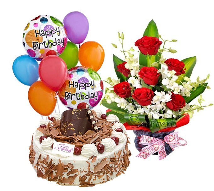 cake,flowers & balloonsBlack forest cake ,12 roses & 2 happy birthday & 6 ballons |