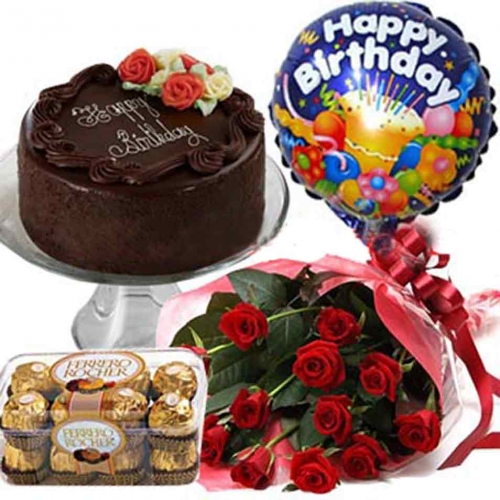 Birthday Cake , 12 roses , ferrero & ballonLayers of chocolate nut wafers w/ rich butter cream, egg & nut filling; covered with butter icing & sprinkled w/ chopped cashew nuts. |
