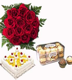 WonderfulMocha cake,1 dozen red roses bouquet and 16 pieces ferrero rocker chocolates for your loveone. |