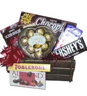 Chokolate Basket-14Includes: Chocopie 168g, Cadbury Fruit & Nut 150g, Hershey's Milk Choco 40g, Ferrero Rocher in Heart-Shaped Gift Box, Hershey's Kisses 40g, Toblerone 50g, Meiji Almond 70g. |
