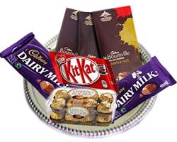 Chocolate Hamper - 6Cadbury Bournville Bars - 3 Nos Cadbury DairyMilk Choco Bars - 2 Nos,65gm each Kitkat Chunky Chocolate - 1 No Ferrero Rocher - 16 pcs |