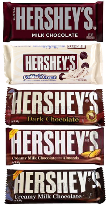 Hershey's Chocolate 5 Assorted BarsMilk Chocolate 40g - Cookies & Cream 40g - Dark Chocolate 40g - Creamy Milk Chocolate with Whole Almonds 40g - Creamy Milk Chocolate 40g |