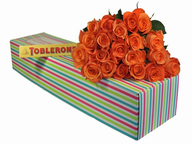 24 Orange Roses in a Box with Chocolates24 Orange Roses in a Box with 400 g toblerone Chocolates |