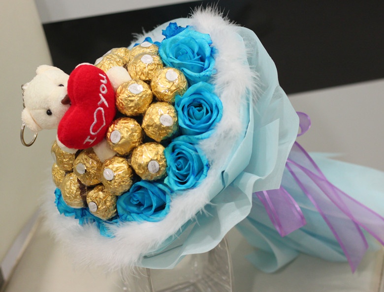 Blue Rose & Ferrero Rocher12 Blue rose with 16 Ferrero Rocher Chocolate & Heart Shape pillow and 9 inches teddy bear. |
