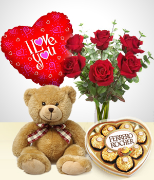 Valentines Silver ComboWe have the perfect gift for Valentines..... Includes: - 6 rose in a vase - A teddy bear 24 inchses - I love you balloon - A chocolate heart shaped box |