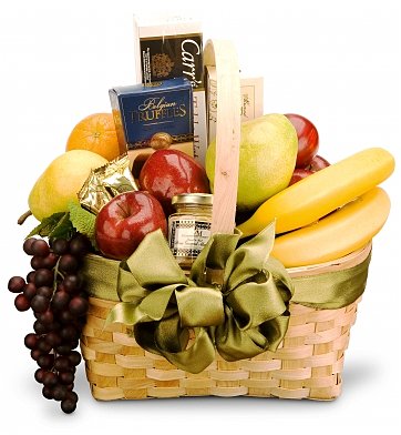 Sophisticated TastesA gift of distinction filled with the most delicious assortment of foods for any occasion. An elegant handled basket holds the freshest fruits, such as oranges, apples, kiwi, pears, bananas, and grapes. The fruits are complemented by savory snacks such as gourmet canned items , cheeses, and crackers. For a crowning touch, we add a selection of candies or chocolates. Exact basket and components may vary by season, delivery location, and size ordered. |
