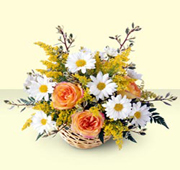 Come on DarlingThis sweet arrangement of white daisies, pink mini carnations, and hot pink roses is complemented by purple monte casino and white waxflower. Designed in a handled basket, it's sure to send your special greetings with style. |