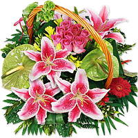 Love AffairPink roses, kaiser lilies and red gerberas offest by green anthuriums are arranged in a basket. The colors of love converge in this effortlessly gorgeous arrangement to make it the perfect gift.Pink roses, kaiser lilies and red gerberas offest by green anthuriums are arranged in a basket. The colors of love converge in this effortlessly gorgeous arrangement to make it the perfect gift. |