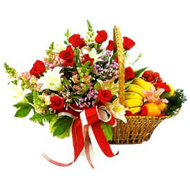 Especially For You...MOmOranges, apples and bananas complete this basket of flowers with the juicy, citrus sweetness they bring out. Fruits Arrangement (6 item) & 6 red roses and stargaizer in a basket. |