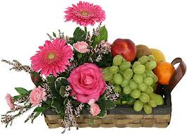 Fruit basket for momDescription: Gerbera with carnation and rose 6 pcs pink comes with assorted fresh fruit including apples, oranges and grapes,pears, banana,mango in a basket With Flower Arrangement (6 items fruits) |