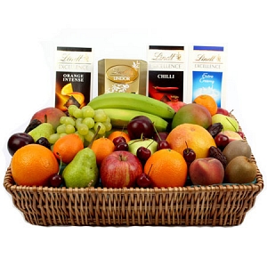 Lindt Chocolate and Fruit HamperA delicious fresh fruit basket including delectably smooth and creamy Lindt chocolate creating an unforgettable taste sensation. A true delight for milk chocolate lovers who appreciate the finesse and quality of a classically perfect milk chocolate. fruits 10 items 3 lindt bar ,100 g each lindt chocolate box. |