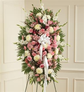 Funeral_Pink & White Sympathy Standing SprayThis Sympathy Standing Spray, in shades of peach, orange and white, is a beautiful symbol of your sympathy and support. • Pink roses, stargazer lilies, spray roses, white carnations and more • An appropriate gift for family, friends and business associates to send directly to the funeral home - |