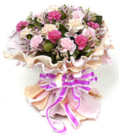 Colorful Feelings6 pink carnations, 6 purple carnations, 6 carnations with lily and green foliages |