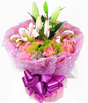 Feeling of Happiness19 pink carnations, 2 pink lilies with purple net inside and pink crepe paper outside. |