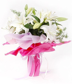 Moving Feeling5 stalks white perfume lilies, with fillers decorate and tissue paper paper packed bouquet. |