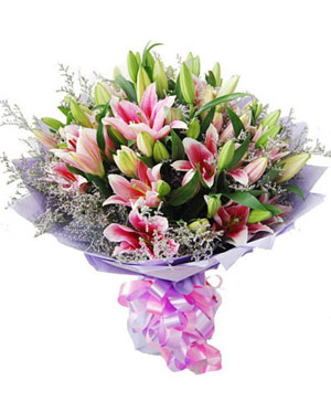 My Intention6 pink lilies bouquet including limonium belt laard and green. |