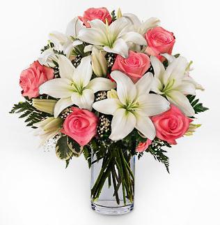 SEDUCTIVEA classical floral bouquet with pink roses and white lilies. Vase is not included. |