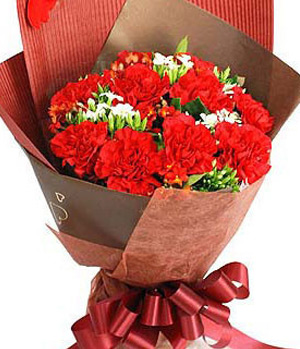 Send Happiness Word18 red carnations with small flowers ornaments, single face brown paper inside, red crepe paper outside, fan-shaped package . |