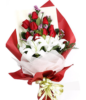 Special Gift9 stem red roses, 2 white lilies, forget-me-not and green leaves decorated. Red and yellow, pink paper wraps. |