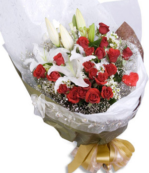 Speed ​​Lovered roses 20 stems, perfume white lilies 5 stems with baby's breath and green stuff. White gauze, gray crepe paper and ties bowknot hand bouquet |