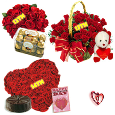 Eminent Love WishesHow surprising to your loved ones when their Special valentine day begins 2 days earlier. Send this lovely Hamper countinuosly for 3 days which includes : 12th Feb - Bunch of 12 Red Roses along with Ferrero Rocher Chocolate Box (Net Weight : 200 gms) 13th Feb - 24 Red Roses in Basket Arrangement along with Cute Teddy Bear (Size :8 inches) +pillow 14th Feb - 36 Red Roses Heart Shape Basket Arrangement along with 1/2 Kg Chocolate Cake + Valentine's Day Card. - |